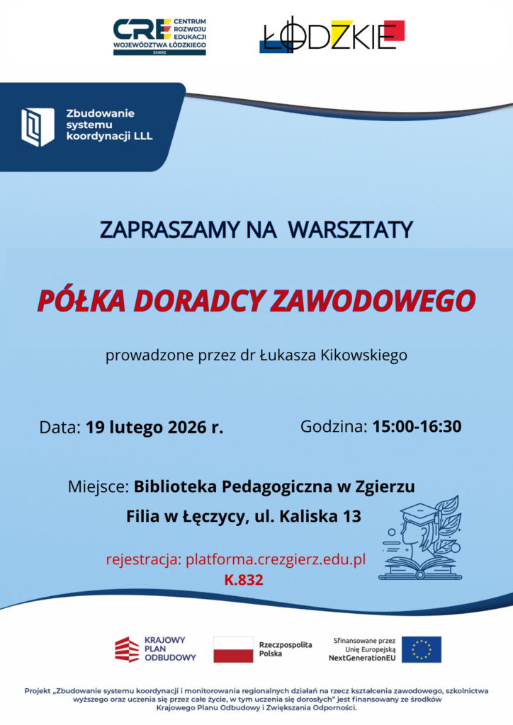 Zapraszamy na warsztaty : “Półka doradcy zawodowego”, prowadzone przez dr Łukasza Kikowskiego do Biblioteki Pedagogicznej w Łęczycy w dniu 19 lutego b.r. na godz. 15.00.